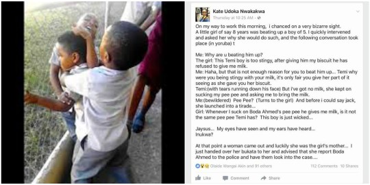 A Nigerian lady has taken to Facebook to narrate an incident that happened while on her way to work. According to the lady, she bumped into a little girl beating up a little boy, who she alleged didn’t give him milk after sucking his pee-pee.