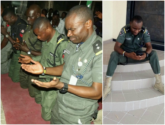 Nigerian police, Akinola Ola Rotimi shared a photo with his colleagues kneeling down and thanking God for their safe return three months after being in the North.