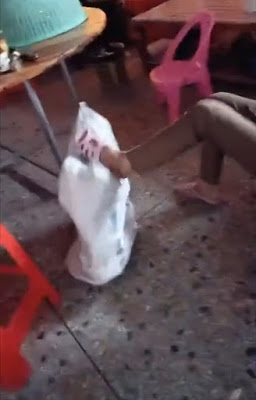No suspects have been identified or arrested, according to police in Lianjiang City, in South China’s Guangdong Province. It is unclear what the young girl did to deserve the inhumane treatment as the video starts with the child already inside the white sack usually used to catch snakes or other reptiles.