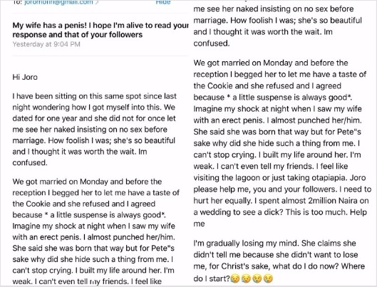 Uncategorized ‘My wife has a penis’ – Man cries out Date: April 19, 2017Author: daybreaknewonline 0 Comments A man has cried out to relationship blogger, Joro and his audience about his wife who he claims has a penis. He had this to say Shocked? Yeah me tooAny advice or similar problem(s)? Share this: Share on X (Opens in new window) X Share on Facebook (Opens in new window) Facebook Share on LinkedIn (Opens in new window) LinkedIn Share on Pinterest (Opens in new window) Pinterest Share on Telegram (Opens in new window) Telegram Share on WhatsApp (Opens in new window) WhatsApp Email a link to a friend (Opens in new window) Email Like Loading... Related