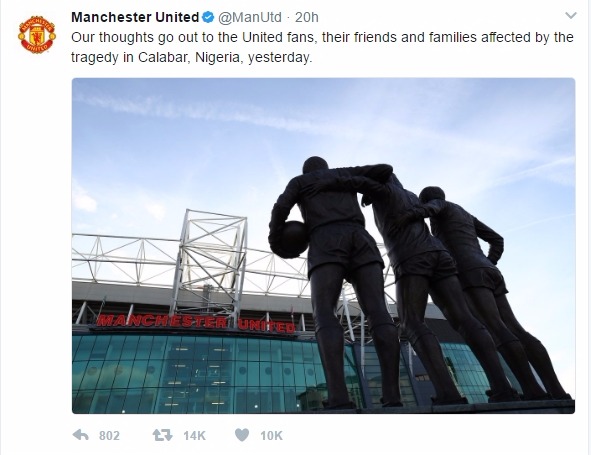 Manchester United has taken to their official Twitter account to mourn their lost Nigerian fans saying their thoughts are with them.