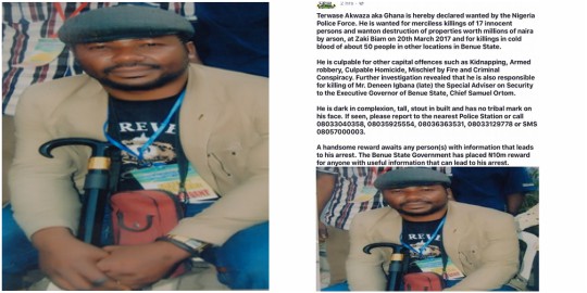 The Nigeria Police Force, has placed a N10M bounty on the head of a notorious killer, Terwase Akwaza aka Ghana, for reportedly killing more than 17 people in Zaki Ibiam area of Benue State, and another 50 in a different location, destroying goods worth millions of Naira.