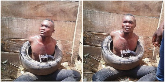 An armed robber who was nabbed this morning while trying to rob residents of Sapele, Delta state, was beaten and humiliated by angry residents. He was forced to pose with his locally made pistol, after a car tyre was put on him.