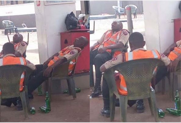 Three officials of the Federal Road Safety Corps will face disciplinary action after they were captured at a filling station sleeping after allegedly consuming bottles of beer.