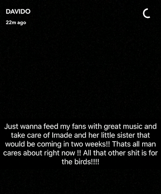 The singer who is expecting his second daughter with an Atlanta based lady, Amanda, has revealed via his Snapchat that she would be born in two weeks.