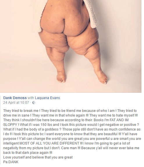 “They tried to break me ! They tried to be friend me because of who I am ! They tried to drive me in sane ! They want me in that whole again !!! They want me to hate myself !!! They think I shouldn’t be here because according to their. Books I’m FAT AND IM SLOPPY ! What if i was 150 lbs and I took this picture would I get negative or positive ? What if I had the body of a goddess ? Those pple still don’t have as much confidence as I do !! I took this picture bc I want everyone… to know that they are beautiful !!! Y’all have purpose ! Y’all can change the world you are great you are powerful u are smart you are intelligent MOST OF ALL YOU ARE DIFFERENT !!! I know I’m going to get a lot of negativity from my picture but I don’t. Care man !!! Because y’all will never ever take me back to that dark place again !!!