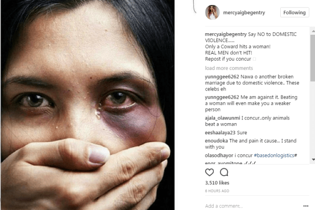 A few hours ago, Mercy through her Instagram page hinted on domestic violence with a post that reads, ‘Say NO to DOMESTIC VIOLENCE…… Only a Coward hits a woman! REAL MEN don’t HIT!’.