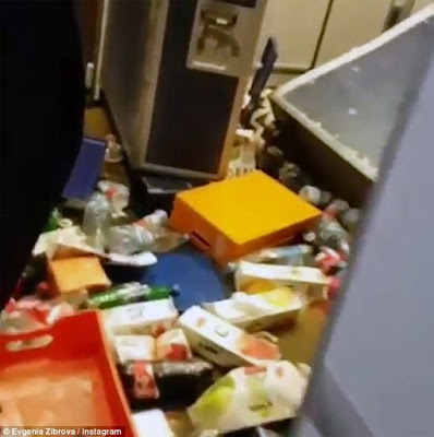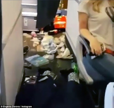 People walking in the aisle and without seat belts on were injured. Luggage as well as food and drink from the trolleys was strewn all over the cabin (right and left).