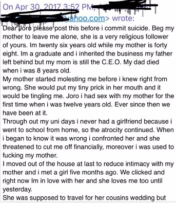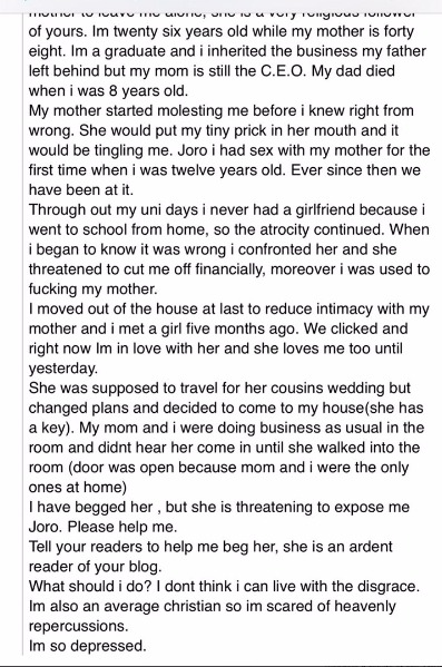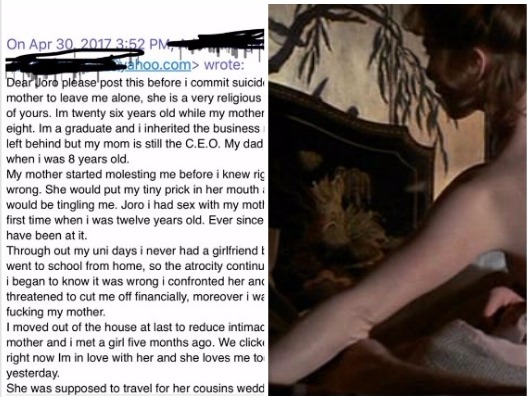 An unidentified 26-year-old Nigerian man who has constantly been sexually abused by his mother after he lost his dad at the age of 8 has cried out, opened up on the act that seems to be hunting him.