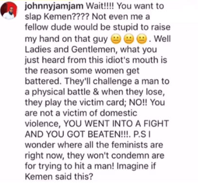 A Nigerian Instagram user, @johnnyjamjam has used TBoss’ statement about Kemen as an example to highlight why most women fall victim of domestic violence.