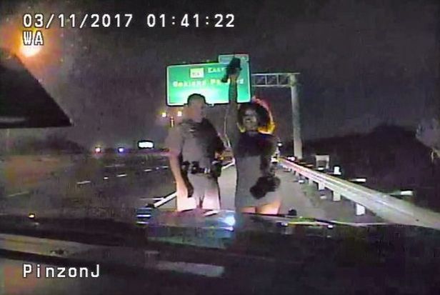 She then stepped over the guardrail of the motorway and proceeded to relieve herself – despite protestations from the troopers.