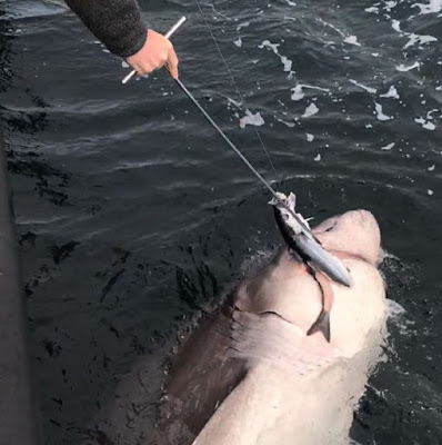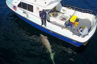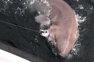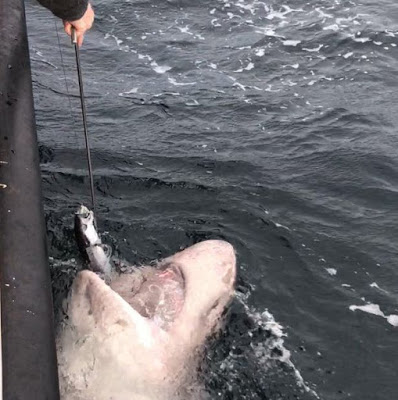 It was impossible to heave the specimen on board but experienced boat skipper Luke Aston used the recognised formula and measuring its length and two metre girth to calculate its weight.