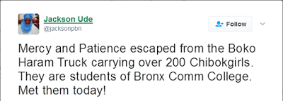 Mercy and Patience escaped from the Boko Haram Truck carrying over 200 Chibokgirls. They are students of Bronx Comm College. Met them today!..They girls were excited when I told them more have been freed’