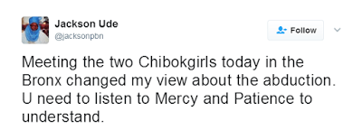‘Meeting the two Chibokgirls today in the Bronx changed my view about the abduction. U need to listen to Mercy and Patience to understand.’
