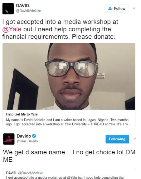 David who has been accepted for a media workshop at Yale University had gone to Twitter to seek for financial support from friends to raise about $3,500 for his tuition fee. Upon stumbling on the post, the ‘If’ singer who spotted that he was bearing same name with the journalist, decided to help him out with the fee.