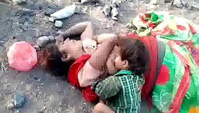 This is the tragic moment a crying toddler desperately tries to drink his mother’s milk, unaware that she is dead. Police were called to reports of a dead body near train tracks in Damoh district, Madhya Pradesh, India, this morning.