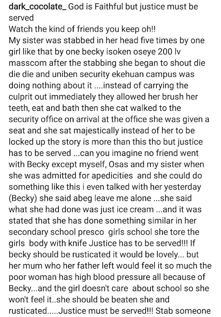 “God is Faithful but justice must be served Watch the kind of friends you keep oh! My sister was stabbed in her head five times by Becky Isoken Oseye – 200 level Mass communication student
