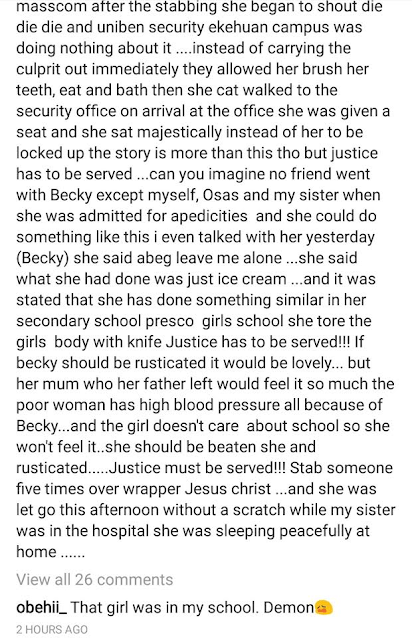 “Justice has to be served! If Becky should be rusticated it would be lovely but her mum who her father left would feel it so much. The poor woman has high blood pressure all because of her and the girl doesn’t care about school so she won’t feel it. She should be beaten she and rusticated.. Stab someone five times over wrapper? Jesus Christ. and she was let go this afternoon without a scratch. While my sister was in the hospital, she was sleeping peacefully at home.”