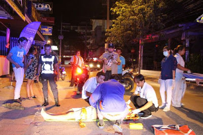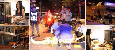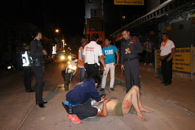 But at 5am this morning the man fell after he went for a cigarette outside. Onlookers covered him with a small towel and gave him a pair of shorts as rescue workers bandaged his head. An ambulance rushed the man to Banglamung Hospital where he is now recovering.