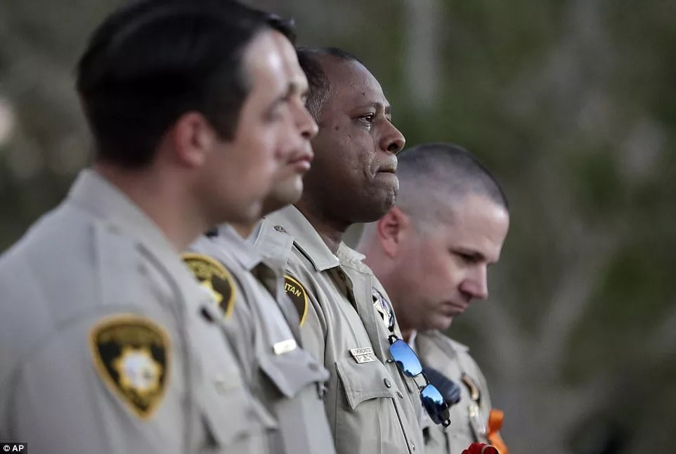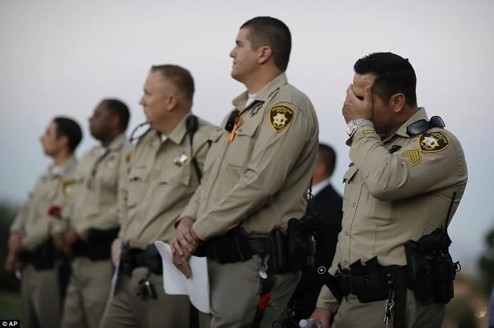 Las Vegas police officer Jonathon Ghebrecristos, second from right, cries during the beginning hours of the candlelight vigil.Photo:AP.