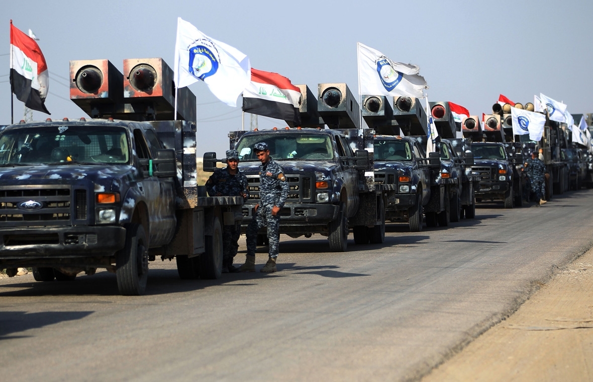 Members of the Iraqi forces stand next to vehicles mounted with rocket launchers as they prepare to head to Kurdish peshmerga positions on the southern outskirts of Kirkuk on Sunday 15 October