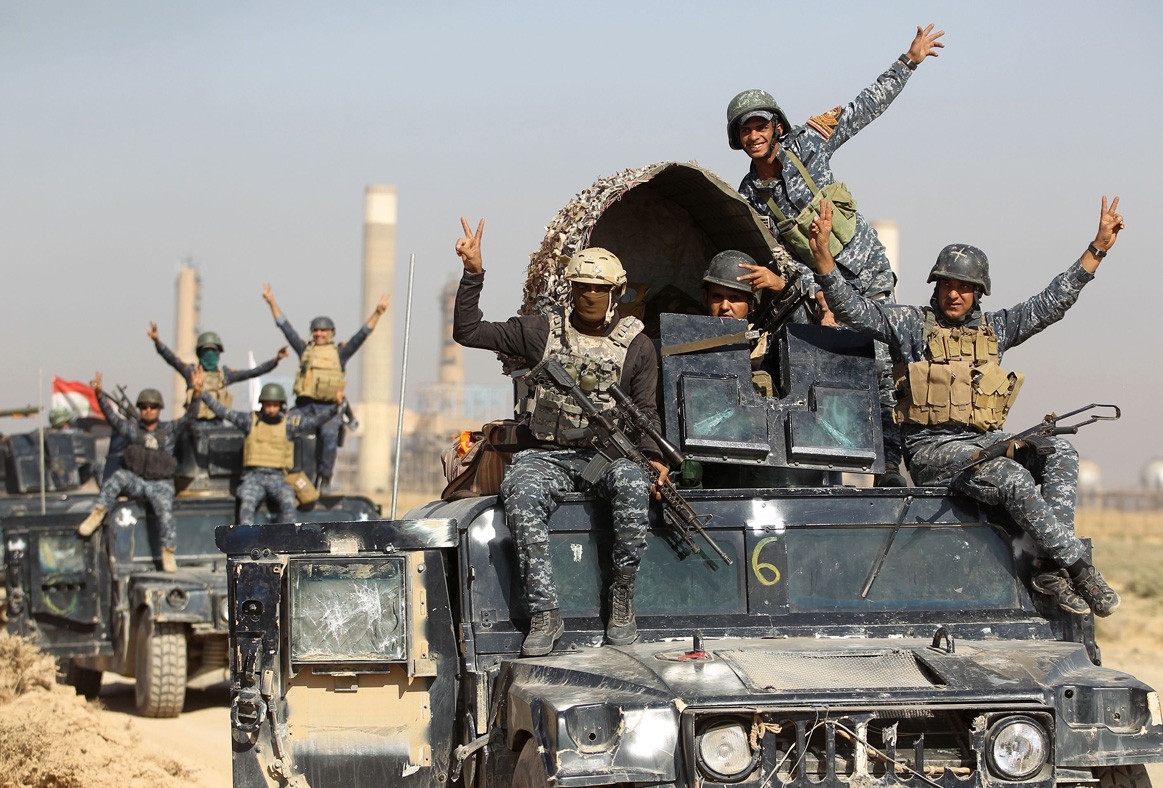 Iraqi forces flash the sign for victory while driving towards the city of Kirkuk