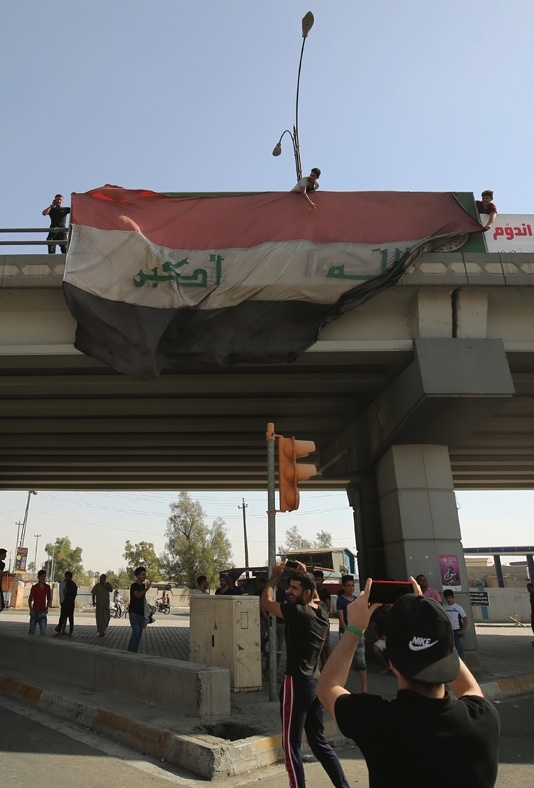 An Iraqi national flag is hung on a bridge while forces advance towards the centre of Kirkuk