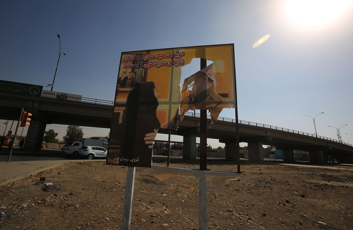 A damaged billboard bearing a portrait of Kurdish regional president Massoud Barzani