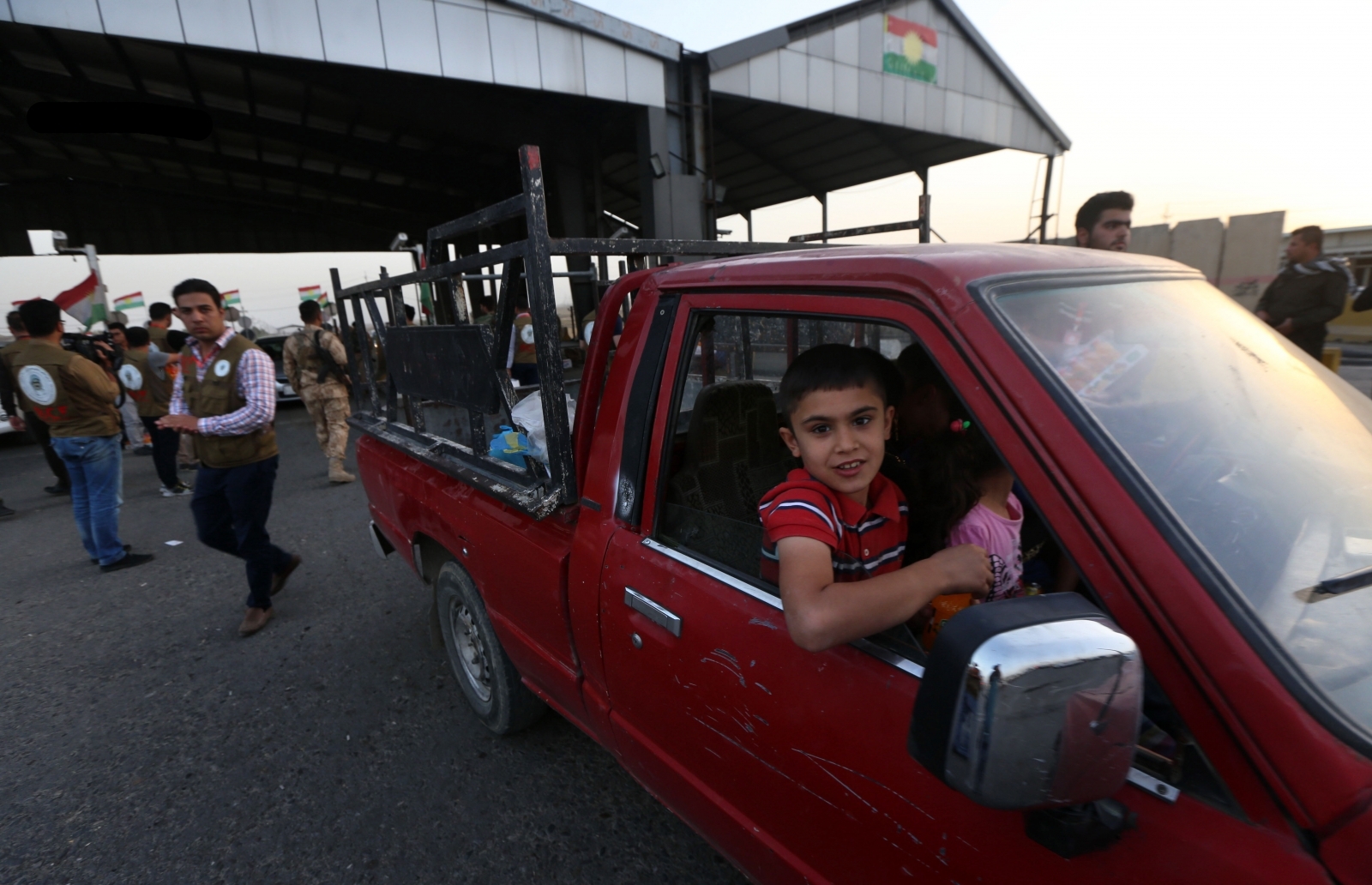 Iraqi Kurdish families cross a checkpoint in Altun Kupri, south of Arbil, the capital of the autonomous Kurdish region of northern Iraq