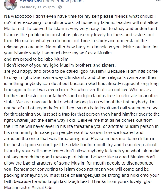 Aishat who has since reverted to her maiden name since her marriage crashed is still using her husband last name online to spread false propaganda that she converted to Islam from Christianity.