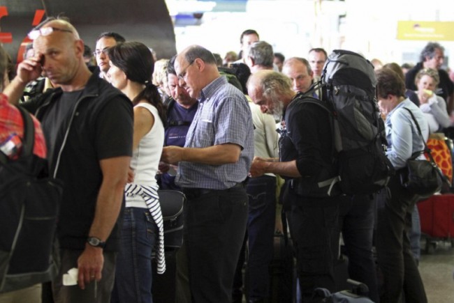 Passengers wait in queues following the cancellation of flights, at Faro airport April 15, 2010