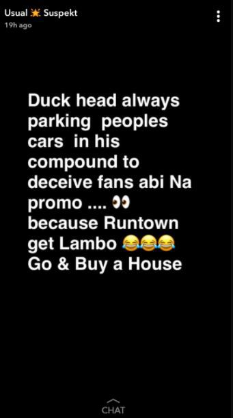 “Duck head”, a term used to describe Tekno, “always parking peoples cars in his compound to deceive fans abi na promo …. because Runtown get lambo. Go and Buy a House”.