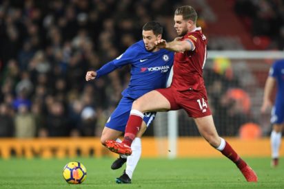 Chelsea’s Belgian midfielder Eden Hazard (L) vies with Liverpool’s English midfielder Jordan Henderson (R) during the English Premier League football match between Liverpool and Chelsea at Anfield in Liverpool, north west England on November 25, 2017. / AFP PHOTO
