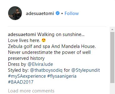 Beautiful Nollywood actress, Adesua Etomi has put the controversies of her unclad photo leak behind her to enjoy her trip in South Africa as she eyes her honeymoon in January, 2018.