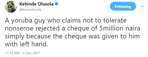 A Twitter user Kehinde Olusola, has shared how a yoruba man refused to accept a cheque of N5 million naira, because it was presented with left hand.