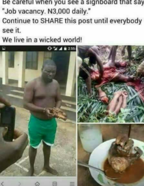 Uncategorized 3000 naira daily job seekers killed and used for pepper soup Date: December 10, 2017Author: daybreaknewonline 0 Comments Facebook user posted this on facebook today of people who are in the name of 3000 naira daily job are being slaughtered and used for pepper soup. However the reliability of this is not certain but we should be conscious. From Sunday Unity blog. com Share this: Share on X (Opens in new window) X Share on Facebook (Opens in new window) Facebook Share on LinkedIn (Opens in new window) LinkedIn Share on Pinterest (Opens in new window) Pinterest Share on Telegram (Opens in new window) Telegram Share on WhatsApp (Opens in new window) WhatsApp Email a link to a friend (Opens in new window) Email Like Loading... Related