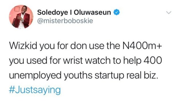 He wrote; “Wizkid you for don use the N400m you used for wrist watch to help 400 unemployed youths startup real biz.