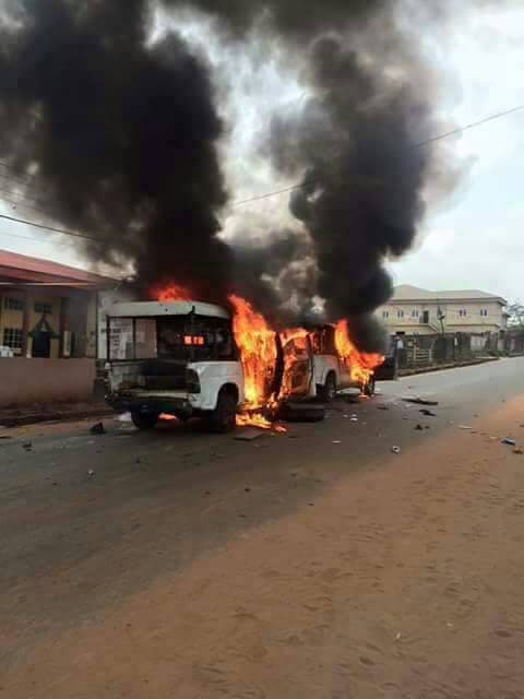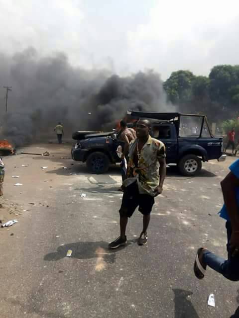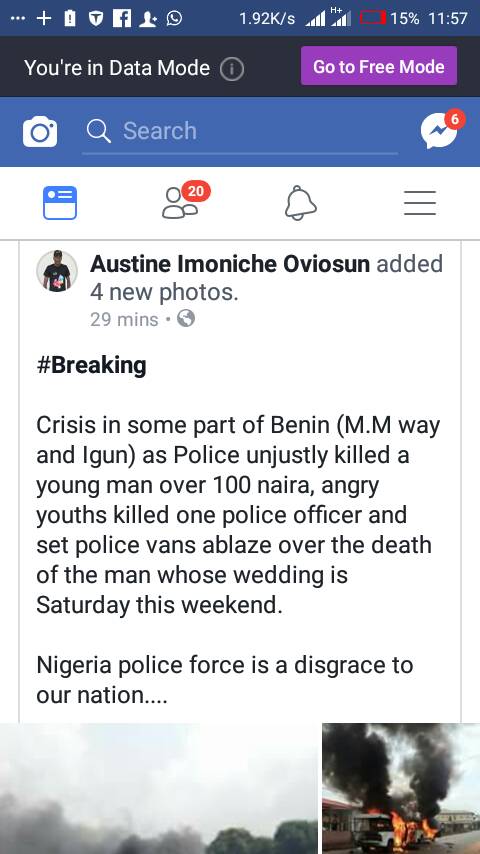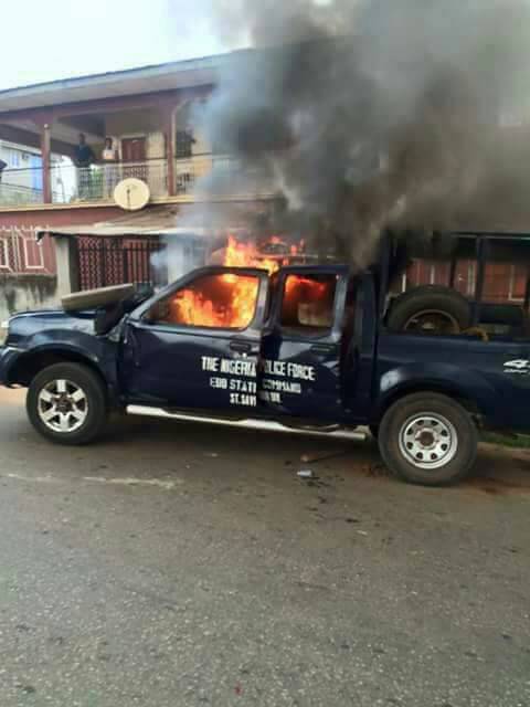 Crisis in some part of Benin (M.M way and Igun) as Police unjustly killed a young man over 100 naira, angry youths killed one police officer and set police vans ablaze over the death of the man whose wedding is Saturday this weekend.