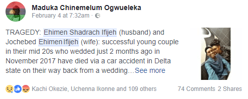 Ehimen Shadrach Ifijeh (husband) and Jochebed Ehimen Ifijeh (wife): successful young couple in their mid 20s who wedded just 2 months ago in November 2017 have died via a car accident in Delta state on their way back from a wedding ceremony.