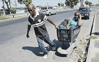 The unemployed 42-year-old from Never Never squatter camp in Philippi, Cape Town, pushes his girlfriend in a shopping trolley wherever they go!