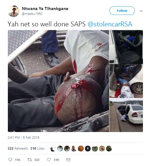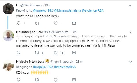 According to reports, the armed robbers who were on their way to rob were confronted by the police. Six were killed in Mpophomeni, Howick and these ones managed to flee all the way only to be cornered near Marianhill Plaza and shot dead.