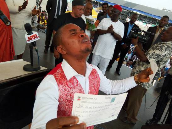 Yesterday, while receiving a cheque from Mrs Ugo Nneoma Rochas Okorocha, containing the huge sum, the doctor went on his kneels with utter gratitude to God. He continued to cry uncontrollably for several minutes with overwhelming joy from family and friends.