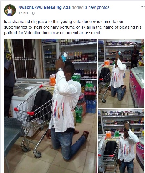 A Nigerian man has been given the disgrace of his life after he was reportedly caught stealing N4000 worth of perfume at a supermarket on Valentine’s Day to please his girlfriend.