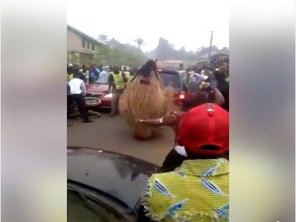 In the video which has gone viral online, the masquerades and the Lord’s Chosen Mopols crossed path on a narrow road.