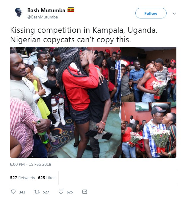 Young men and women were pictured kissing each other and according to reporat, it was during a Val party in Kampala, Uganda. It was tagged Kissing competition in Kampala, Uganda. This photos is currently trending on social media.