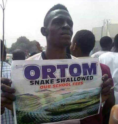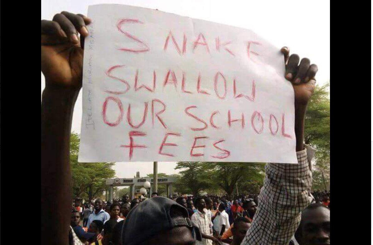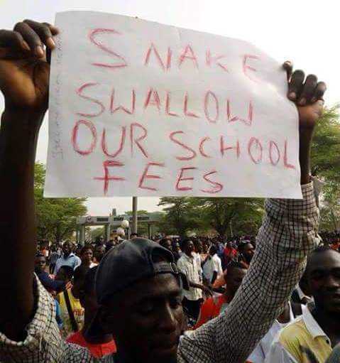 While protesting today, the students held placards claiming snake has swallowed their school fees.