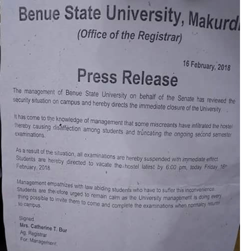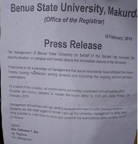 The management of Benue State University, Makurdi on Friday shut down the institution following student unrest over tuition fees.
