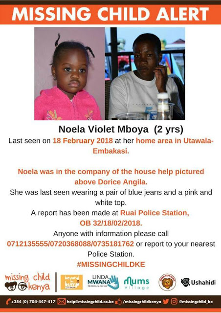 A missing person’s report has been filed at Ruai police station and the family is urging anyone with information regarding Noella or Dorice Angila to call 0712135555/0720368088/0735181762.