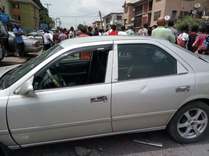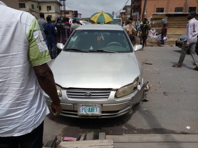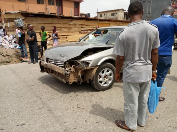 While on top speed, the robbers ran into a moving vehicle along a Secondary School, as two of them were apprehended while trying to flee the scene of the accident. One of the robbers was said to have taken a bag of money and ran away.