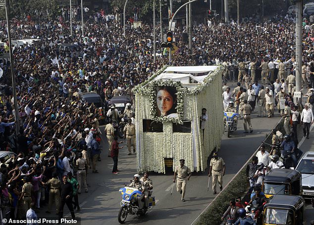 Huge crowds of mourners — some carrying roses, others holding photos of the late actress — lined Mumbai’s streets to see their beloved idol embark on her last journey.